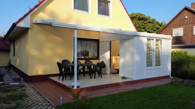 Dach und Stützen aus Alu, zahlreiche Dachformen wie Pult-, Walm-, Satteldach, Dacheindeckung wahlweise Kunststoff-Stegplatte oder VSG 10mm, Standardfarbe RAL 9016 weiß, seidenmatt, alternativ jeder RAL-Ton, auch in feinstruktur, lieferbar. Einbau von Fensterelementen oder Glasschiebetüren mit oder ohne Rahmen, auch nachträglich, möglich.