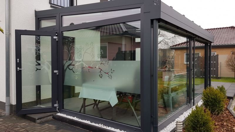 Dach und Stützen Alu, Fenster Kunststoff. Extras: Dach in Sonderfarbe, Fenster farbig foliert, Alu-Falttüren, Front mit integrierten Jalousien, Haustür mit Stoßgriff außen und Drücker innen, flache Schwellen, LED-Beleuchtung, Übergroße Front- und Seitenverglasung, Dreifachverglasung...