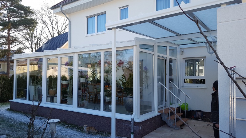 Dach und Stützen Alu, Fenster Kunststoff. Extras: Stulp-Türen, wandseitiger Alu-Unterzug, Fensterbankeinfassung, seitl. Überdachung.