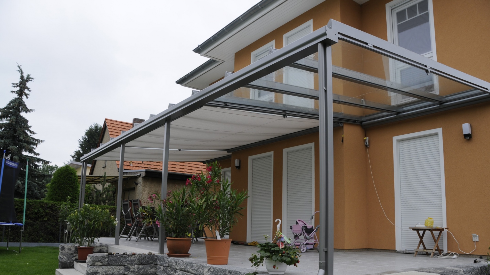 Unterglasmarkisen mit seitlichen Führungsschienen und E-Antrieb, Sonderfarbe RAL 9007, Becker-Funkempfänger, Becker-Handsender