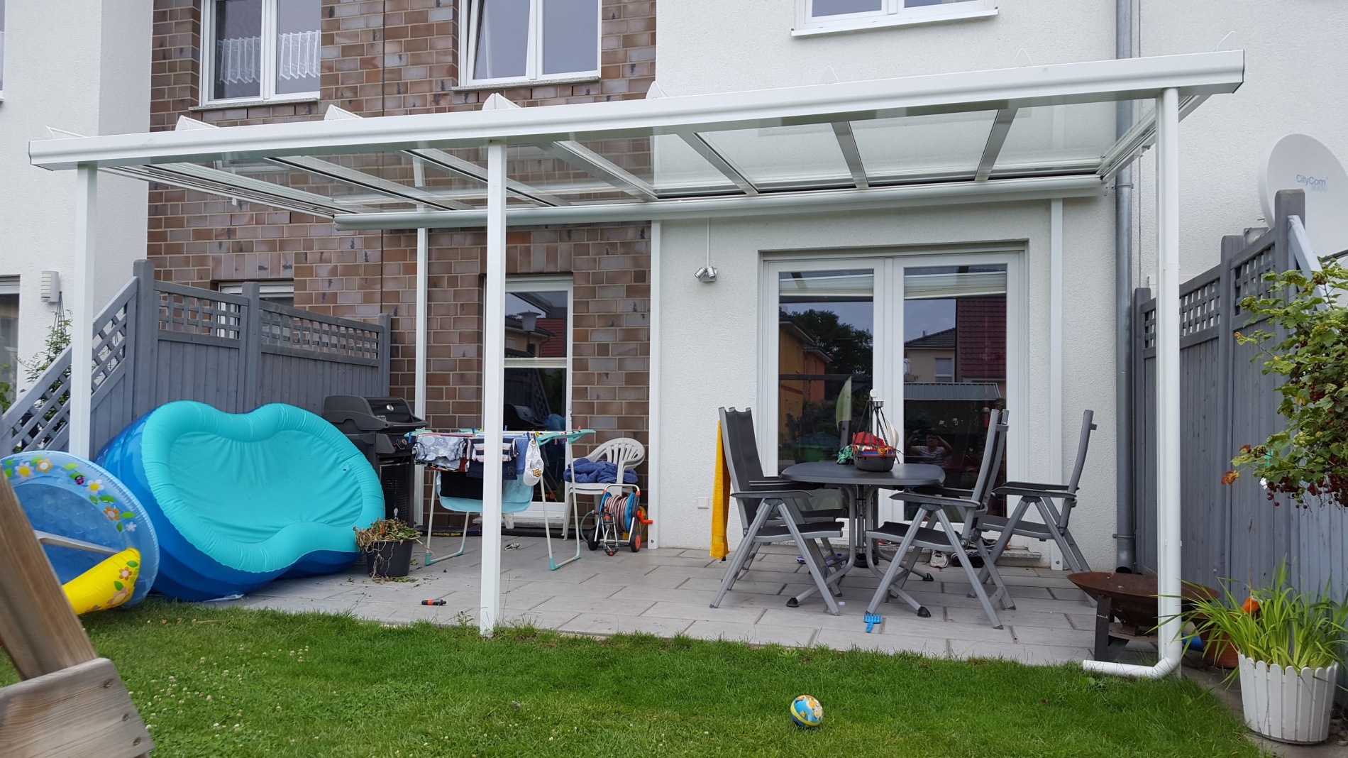 Dachprofile, Stützen weiß, Dacheindeckung Polycarbonat-Stegplatte.