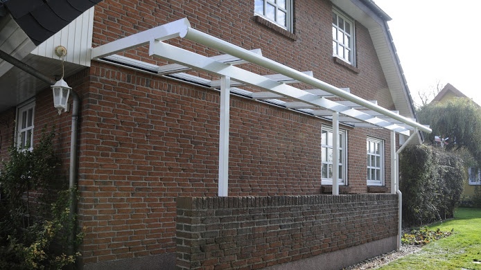 Dachprofile, Stützen weiß, Dacheindeckung Polycarbonat-Stegplatte.